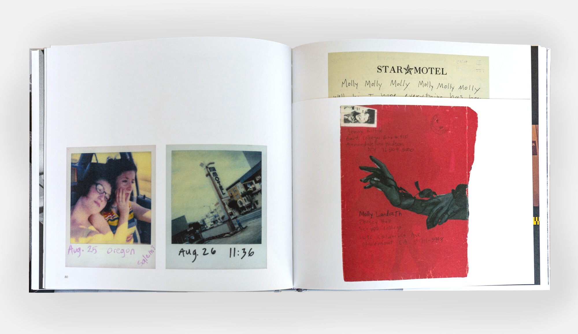 Accompanying the photographs—which take us through daisy fields, bridges at night, abandoned schools, diners, carnivals, and the farmlands of rural Washington—are also snapshots, notes, polaroids, contact sheets, letters, and collaged envelopes. A handwritten note by Landreth reads, “…I took the email as an invitation to come over. I hope that’s okay. So I’m at the Bauhaus [coffee shop] waiting for you. Please join me.” It perfectly encapsulates the urgency of a free, young queer love at the cusp of the aughts and the digital revolution.