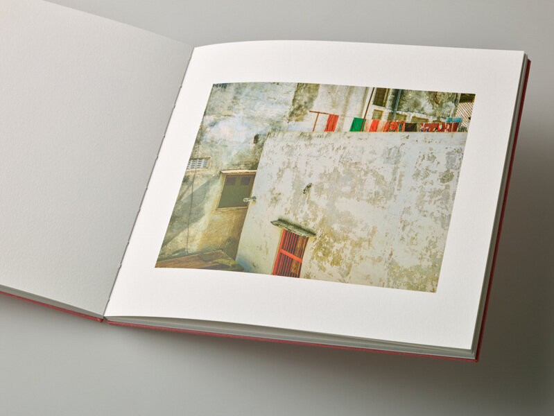 The book opens with quiet views of domestic spaces and empty streets looking over the water—blooming trees and flora in a gentle tug-of-war with the architecture. I can almost hear birds chirping. These are the streets of Udaipur, India, where Ahmed’s parents are from, and Rani Road borders one of the various lakes in Udaipur.